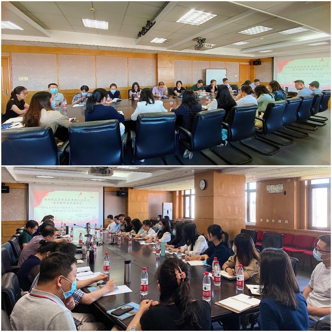 洪俊杰副校长做指导讲话。他指出,推进“双一流”建设根本在于人才,高层次人才对骨干教师培养及专业团队建设有着至关重要的作用。在人才评价愈加多元化的今天,如何成长成为高层次人才,是每位教师特别是青年教师应当深入思考的课题。洪校长从人才培养、科学研究和社会服务三方面对青年教师提出建议,希望老师们做到“有亮点、无短板”,要首先扎实做好人才培养工作,在课程思政、教材建设、教学改革等方面积极探索,在学生引导、培养上下功夫;科学研究应围绕国家重大、急需问题开展,努力产出有重大实践贡献的成果;应关注社会服务,在提供决策建议、文化普及、中外人文交流等方面做出自己的贡献。他建议青年教师明确方向、做好规划,入主流、建团队,长期积累、久久为功;希望学院加强规划、集中发力,为青年教师成长提供更多资源、搭建更高平台。