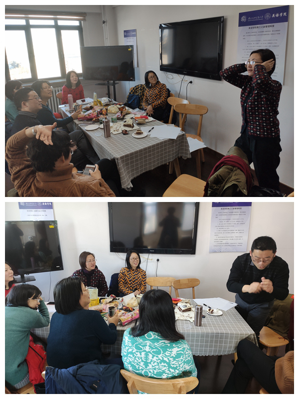 专用英语学系工会小组活动于2020年1月8日中午在诚信楼1314召开,活动形式是茶话会和娱乐节目。一个学期的工作接近尾声,大家心情放松,吃些茶点,聊聊天,谈谈子女教育、寒假计划等,话题众多。学系祖利军教授,曾在希腊担任孔子学院院长多年,跟大家分享了他在希腊见闻以及担任孔院院长的经历,大家都很感兴趣,就此问了许多有意思的问题。茶话会期间老师们做了猜谜游戏,还表演了一些节目,并给得奖的老师颁发纪念品。活动结束,大家带着对新年的期待,互送祝福,合影留念。
