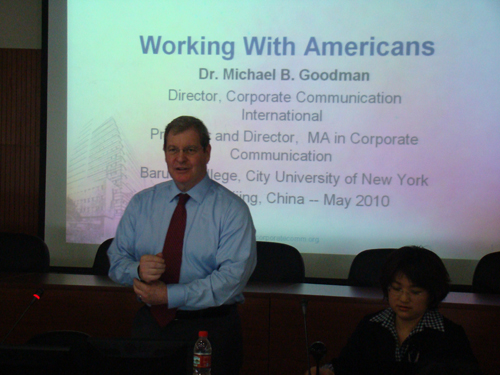 全国首届跨文化商务交际高级研修班于2010年5月20日8:30在诚信楼1412会议厅正式开班。来自全国各大高校的60名学员和我院20多位教师参加了此次研修班。研修班第一个工作坊于5月20日上午8:30-11:45进行,有两位主讲嘉宾,即纽约城市大学Baruch 学院企业传播中心主任Michael Goodman教授和我院商务英语系江春副教授。主持人为商务英语系副主任冯捷蕴博士。