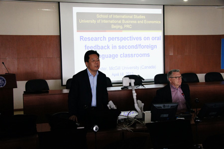 应用语言学研究所和对外经济贸易大学跨文化商务翻译学术创新团队的邀请,加拿大McGill大学教育学院Roy Lyster 教授于2013年4月18日在诚信楼1412做了题为“Research perspectives in oral corrective feedback in second/foreign language contexts”的讲座。国产自拍