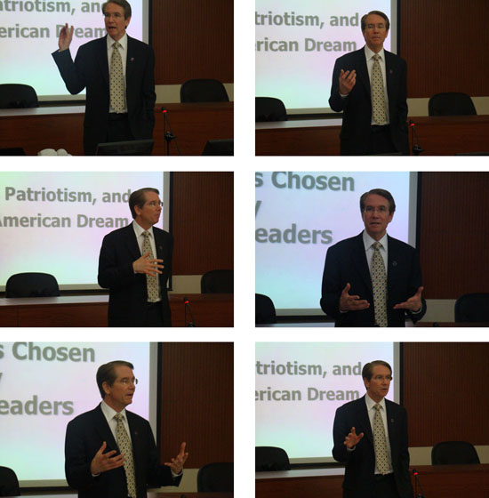 讲座中,Lucas教授的核心观点是,奥巴马赢得2008年美国总统选举的主要原因之一是他有非常强的演讲能力。Lucas教授首先从美国的政治制度开始讲述奥巴马作为一个年轻黑人形象赢得美国总统选举的政治原因。 接着,他为听众展示了奥巴马的演讲片段,并就这些片段分析了奥巴马非凡的演讲技能和功底。这些视屏片段包括2004年6月2日奥巴马首次面对全国的重要演讲;2008年1月8日,在新罕布什尔州竞选失败后发表的“Yes, We can”的演讲;2008年2月16日在反击他的批判者时做的题目为“Just words”的演讲;以及奥巴马的总统就职演讲。Lucas教授对奥巴马每次演讲的内容和风格进行了解读,同时指出技巧和手段固然重要,但演讲成功的关键是演讲内容。Lucas教授诙谐幽默的演说以及生动的视频片断给听众留下了深刻的印象。