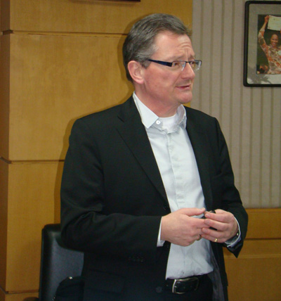 、校商务翻译创新团队和国际商务英语研究所的邀请,著名跨文化商务交际研究专家、德国康斯坦茨应用科学大学教授彼得•富兰克林来我院做系列学术讲座。富兰克林教授主要致力于国际商务环境中的语言文化交流研究,具有丰富的跨国公司实践经验,并且成功培训了众多跨国公司机构员工。此次来访将围绕跨文化商务交际研究动向及方法论问题举办系列学术讲座。
