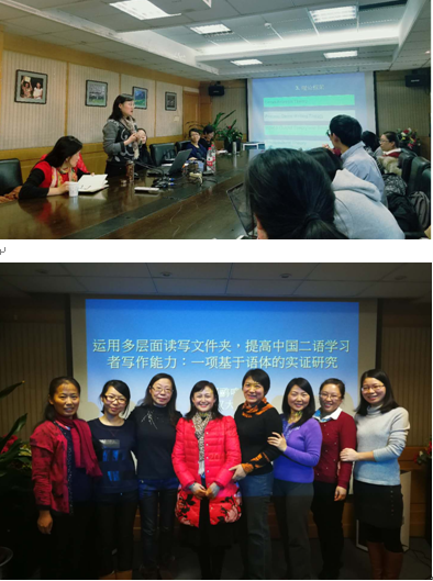 邓教授的讲座围绕多层面“读写文件夹对于二语学习者写作能力的促进”这一研究展开,通过介绍“体裁学习”对于学习者的重要性以及读写文件夹的模式对于学习者的帮助引入研究的具体内容。她首先介绍了国内以及国际上的学者对于读写文件夹在写作教学中的作用认识不足。之后邓教授详细介绍了其质性与量化研究的数据收集、分析与研究发现,展示了部分研究对象的“读写文件夹”样本。其详实的数据、丰富的案例引发了听众的兴趣;老师们纷纷提出了从研究以及教学角度的各种问题,比如蒿青老师跟邓教师深入探讨了读写文件夹在阅读课程中作为教学方法的使用可能性,邓教授都给予了热情与详细的解答。