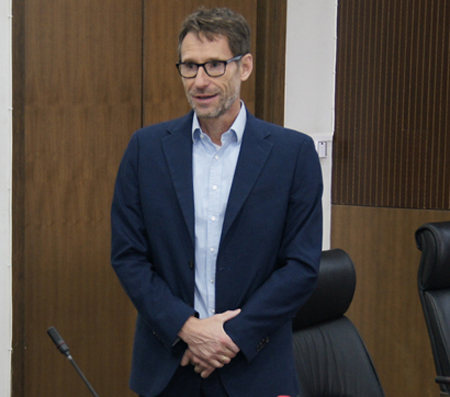 Hans-Jörg Schmid教授,是德国Ludwig Maximilians大学终身教授,担任现代英语语言学部主任,现今是国际核心刊 Journal of Pragmatics and Cognition主编,也是Cognitive Linguistics等多家SSCI期刊的评审编委;发表国际刊成果百篇。他从认知、语用、社会、心理等角度提出语言使用的宏观动态模式,并对语料库中的各种语言现象进行解释。他的研究既有雄厚的历时语言学的视角,又有多视角的现代语料库的数据,提出的模式对广大师生的研究给予很多启发和深思。在场的师生们都有浓厚的兴趣,问了不少问题。