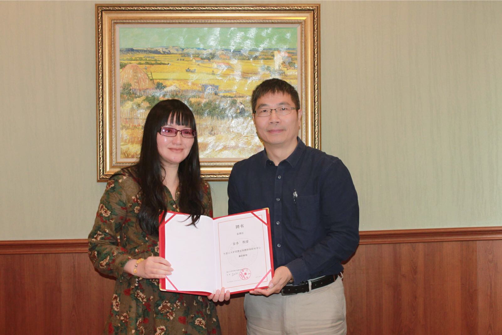 此次年会前,金冰教授还应邀参加了浙江大学世界文学跨学科研究中心主办的“跨学科研究协同创新”高端论坛,并受聘为浙江大学世界文学跨学科研究中心兼职教授,浙江大学罗卫东副校长为金冰教授颁发了聘书。浙江大学世界文学跨学科研究中心是我国文学跨学科研究领域的顶尖学术机构,该中心拥有一支专业的文学跨学科研究队伍,在聂珍钊教授的带领下创立了A&HCI期刊《文学跨学科研究》,引领了国内文学跨学科研究的导向,并在国际上建构中国特色的文学话语体系。此次金冰教授受聘为该中心兼职教授,有助于拓宽国产自拍 与浙江大学人文研究领域的合作空间,在优势互补的基础上,共同发展,以期在新时期跨学科研究领域取得更多成绩。