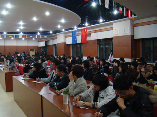 接下来任教授就具体的翻译问题为大家做了深刻的讲解,告诉大家如何翻译得更地道,更口语化。在场同学都认真地看着屏幕上所展出的文字,悉心体会翻译过程中的技巧。