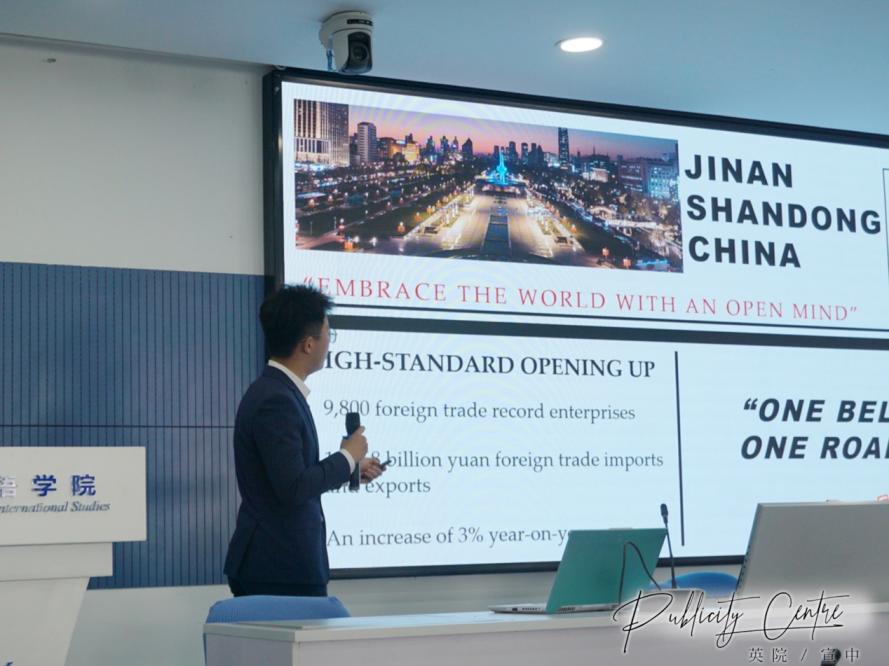 首先上场的是张艺宣同学,他从印度与中国的经济、文化、教育合作讲起,并结合家乡济南的开放与发展突出了“一带一路”带来的经济收益等。他的演讲角度新颖,令现场观众印象深刻。