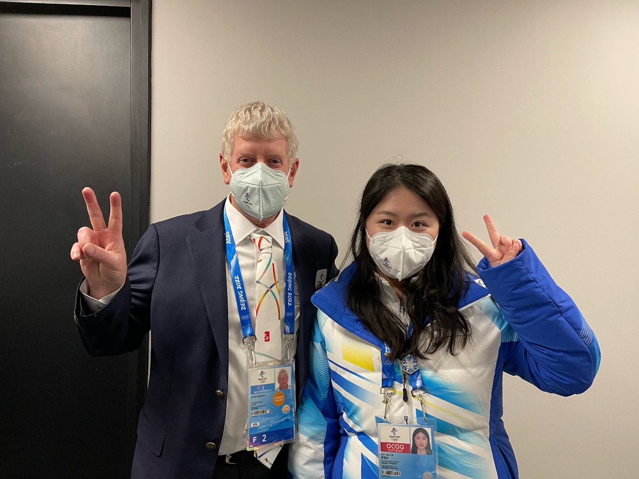 志愿者谢惠霖与短道速滑裁判Peter Worth合影