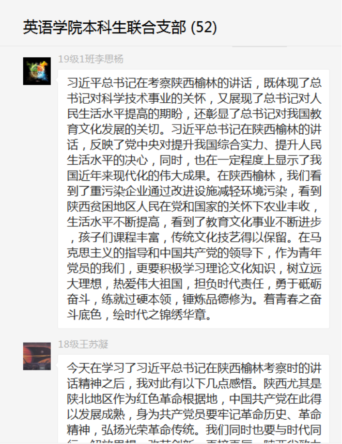 2018级党员周洋谈到,在榆林考察期间,总书记经过田间地头,下地与劳作的农民交谈,亲切友好;随后还参观了学校,为孩子们献上“我祝你们成才”的祝福。我深深地被总书记的爱民情怀感动,看到国家这样关心每一个公民,作为预备党员的我也感到任重道远。党员的本质,就是全心全意为人民服务,孔子说“在其位谋其政”,就是说我们每一个党员都应该一马当先,为服务人民而不懈奋斗,真正将“爱党、爱国、爱人民、爱社会主义”的情感落到实处,在生活当中努力培养自己成为德智体美劳全面发展的社会主义建设者和接班人。”