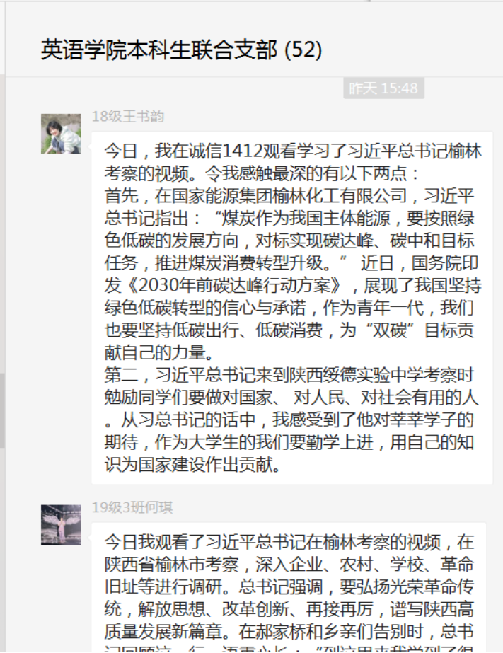 2019级党员张诗怡谈到,习近平总书记在陕西省国家能源集团榆林化工有限公司考察时强调,要坚持以绿色低碳为发展方向,对标实现碳达峰、碳中和的目标任务,推动循环经济煤炭综合利用项目,促进煤炭消费转型升级。碳达峰、碳中和是我国面对全球气候变化和能源安全问题提出的工作目标,也是我国生态文明建设整体布局中的重要组成部分。面对气候变暖所带来的一连串效应,我们作为普通人也应有全局意识和紧迫感,在生活中践行“绿色低碳”的理念,争做“低碳减排、绿色生活”的实践者。