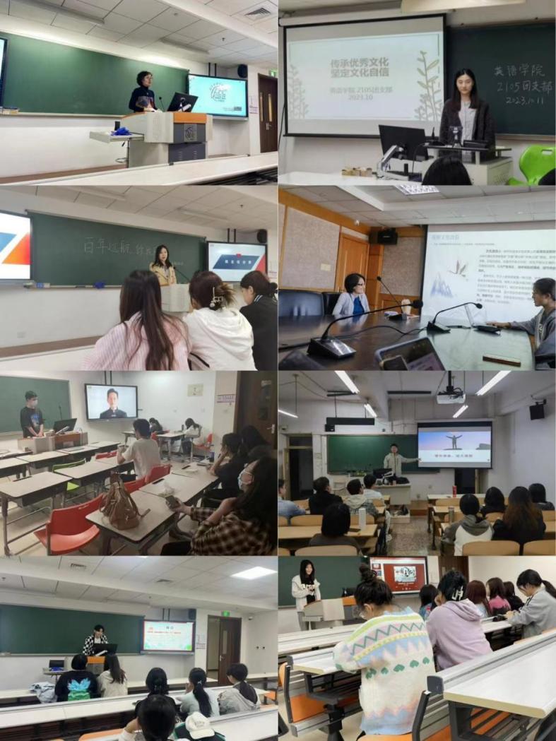 英实2101班以亚运会作为引入开展班会。班长吴珂对杭州亚运会的文化元素作出介绍,并邀请杭州同学探讨这些文化元素与杭州传统文化的关联。班主任付涛老师则结合同学们的专业,从传播学角度出发介绍了生活中的文化元素;英语2101班从反面解读文化自卑和文化自负两种心态,帮助同学们切实理解“文化自信”的概念。班主任李啸初老师提出,同学们要确立坚定的文化自信,从容面对西方文化的冲击和挑战,并在全球化浪潮中不断扩大中华文化在全球范围内的传播和影响;英语2102班班会以同学分享、视频观看、分组讨论的形式展开,旨在深化学生的爱国主义教育、增强文化自信、激发使命担当。班主任时晓英老师做总结发言,鼓励同学们明确理想、奋发向前;英语2103班探讨了如何保持大学生的青春底色,认为当代大学生应树立正确的世界观和人生观,注重内在修养,成为有道德情操和文化修养的优秀青年;英语2104班探讨了传承优秀文化与坚定文化自信的重要性,班主任赵冬旭老师总结并强调文化传承与学术拓展;英语2105班聚焦于文化精品走出国门的话题,班长胡雪阳带领大家探究戏曲出海案例,同学们对中华传统文化出海产生了更深刻的见解;英语2106班班会中,秦莉婷同学、周梓依同学依次展示学习传统书法的成果及参观古建筑的心得体会,引起热烈讨论;英语2107班以国产自拍 校史剧《远航》为导入,介绍我国百年外贸史的几个重要阶段,以及先辈们为中国对外贸易事业的伟大贡献,以此激励同学们奉献青春、砥砺奋斗,为我国外贸事业的发展贡献自己的一份力量。
