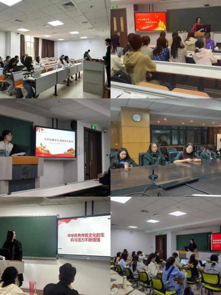 英语2301班在班主任马骧老师和班助王映晓的陪同下一并前往校史馆参观,之后全班同学共同观看电影《建党伟业》,学习党的辉煌历史;英语2302班组织同学们参校史馆,学生在班主任任岳涛老师的带领下,深入学习了贸大人服务国家、勇挑重担的历史,认识到贸大人奋勇拼搏、艰苦奋斗的光辉形象;英语2303班团支书胡梦飞从“识文物品内涵”“学西洋创新知”“跟党走学理论”三个方面讲述了传承和创新中华文化的相关内容,阐述了文物作为中华传统文化载体的重要意义;英语2304班班长雷从慧组织同学们认真学习习近平总书记在文化传承发展座谈会上的讲话精神,同学们依次朗读座谈会中心观点及重要内容;文法2301班举办“传统文化知识竞赛”,王越同学在古诗词竞赛中最先发言,并展现了自己对包括古诗词在内的传统文化的深刻理解,收获同学们的一致好评;文经2301班班长崔琳悦对党史基础知识、中国特色社会主义思想等进行介绍,组织大家共同观看了学校校史馆宣传视频,引导同学们坚定理想信念,砥砺家国情怀。