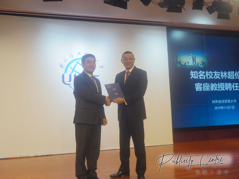 随后,蒋庆哲书记为林超伦博士颁发对外经济贸易大学客座教授聘书并合影留念。