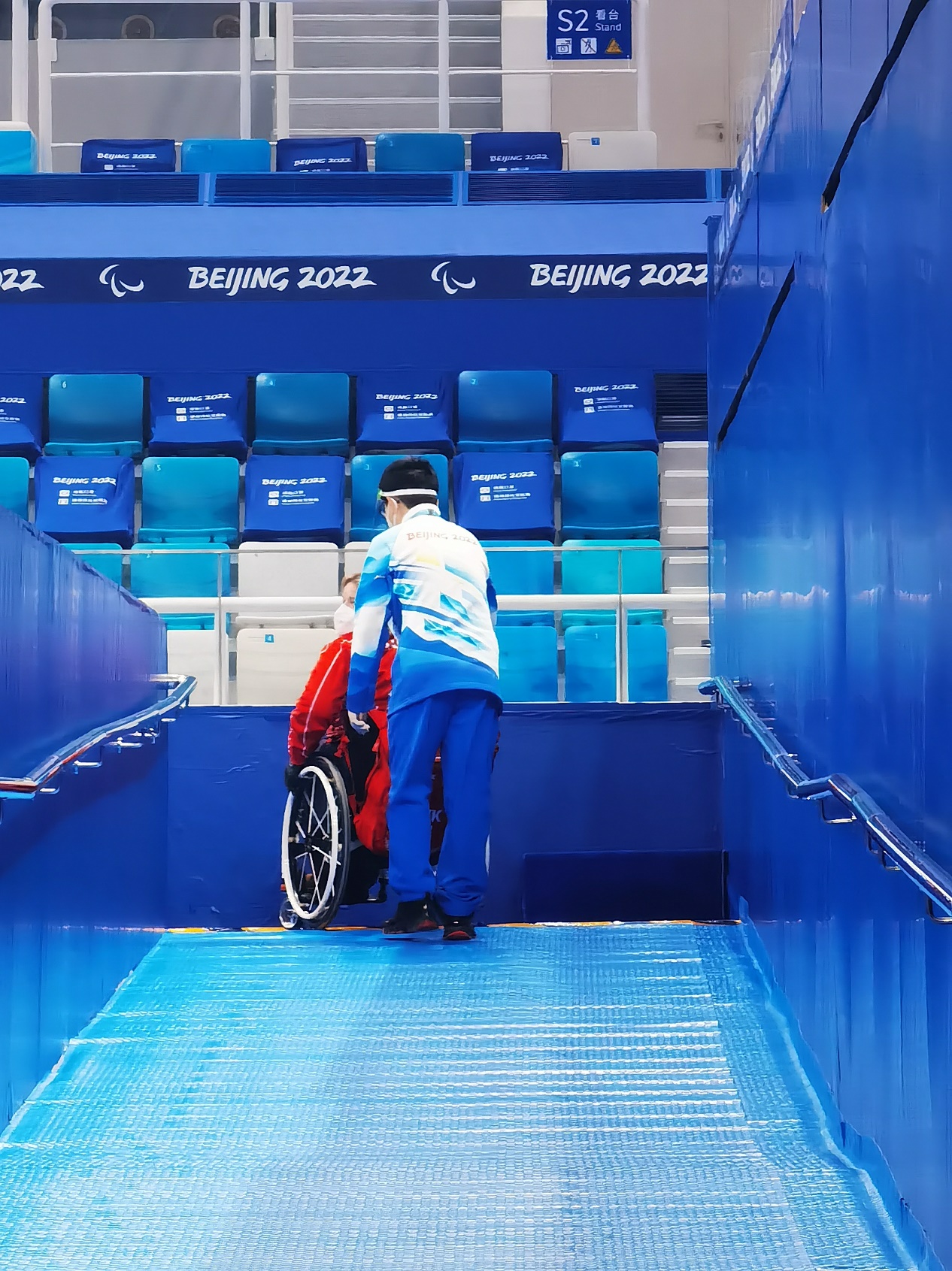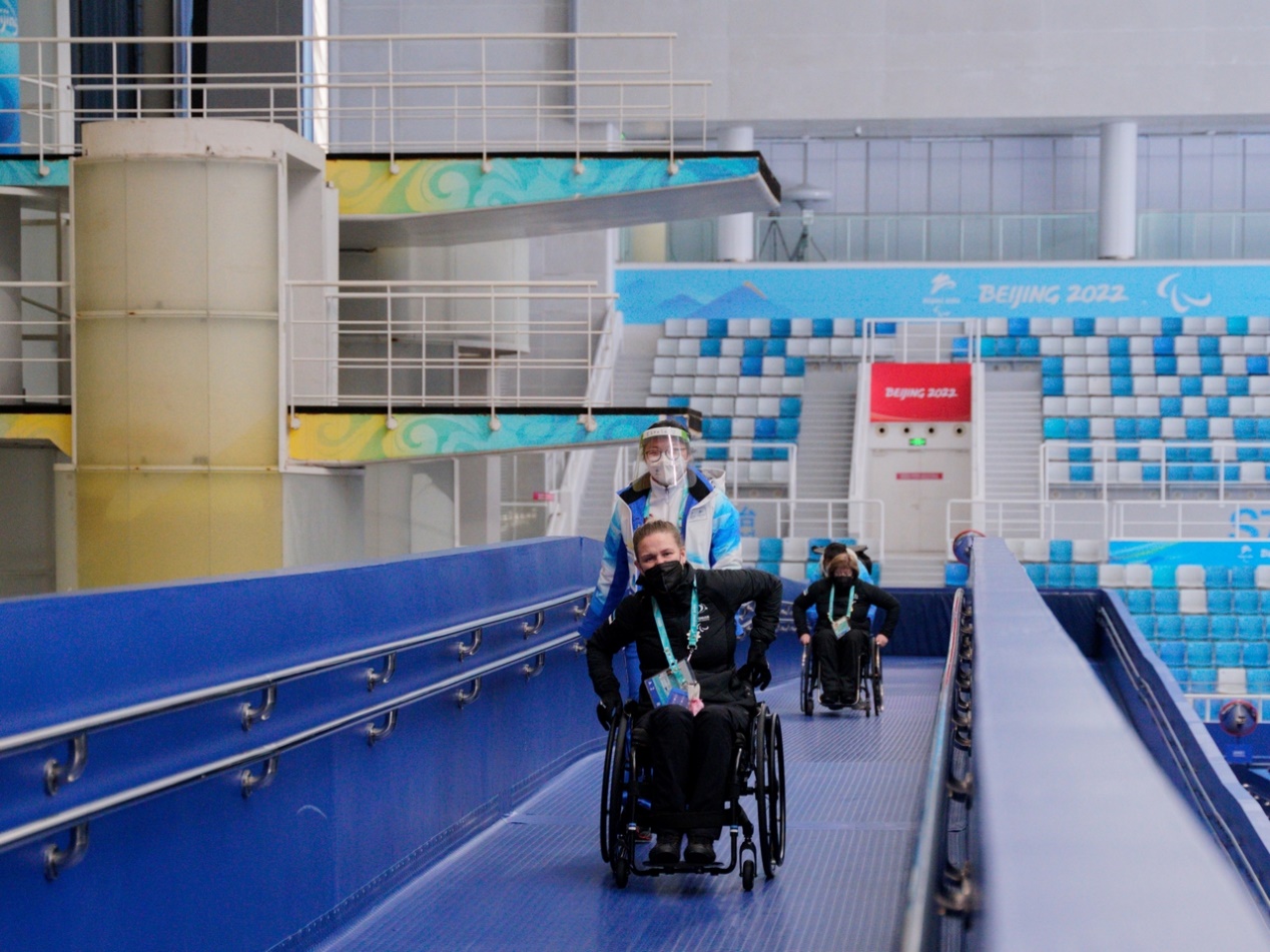由于“冰立方”内为冬残奥会冰壶项目场地,面向有腿部障碍的运动员。因此尽管各岗位大致职责相较于冬奥会没有过多变化,但为了服务残奥会运动员的特殊需求,志愿者们也分配到了一些新任务。