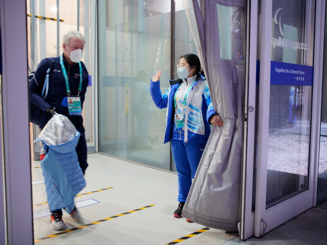 残奥期间验证点的工作新增了一项工作“掀门帘”,即在运动员进馆和离馆时掀起门帘。这是构成场馆无障碍设施的重要环节,也是我们能够与运动员亲切交流的重要渠道。每一次我们都会提前在门口掀开帘子做好准备,用最真诚的笑容迎接运动员们,而他们也会高兴地向我们挥手示意。