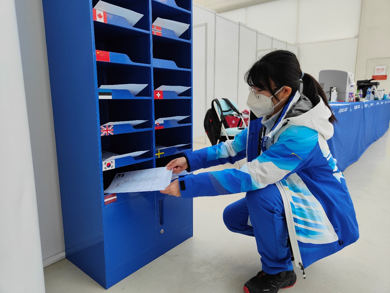 冬残奥会的志愿服务是一项要求细致与耐心的工作,在志愿服务中,志愿者们可谓将细致贴心做到了极致。在“冰立方”场馆内很多细节上,残奥志愿者们下了大功夫。大到多次熟悉演练志愿服务的流程,将整个场馆的情况了然于胸,小到将运动员的不同款餐具与桌椅高度相匹配,志愿者们在每个环节都下足了功夫。为了保证冰面的稳定,整个冰壶赛场有着严格的控温要求,各个通道入口都设置了厚重的门帘。对于健全人而言,一边走路一边打开门帘不是一件难事,但对于轮椅运动员来说,他们在行进的过程中需用双手摇着轮椅慢慢推着自己前行,而面前的这些门帘则会给他们带来一定的麻烦。为了帮助运动员更顺畅地通行,志愿者同学需要时刻守在运动员通道的门帘处,注意观察两侧来人的情况,及时上前掀开厚重的门帘,为运动员们减轻负担,将细致服务做到了极致,力求为远动员创造尽善尽美的参赛体验。此外,在各国信箱‘鸽子笼’布置方面,志愿者们多次模拟运动员坐轮椅的高度,测试运动员伸手拿信箱里竞赛表单的过程,最终将各国国旗贴至最合适的高度上,让运动员们能顺利地取到竞赛信息表单。而在信息公告栏处,志愿者们经过测量,降低了张贴表单的高度,以轮椅运动员最方便的水平视角张贴竞赛日程、成绩单等各项表单。”场馆内每一环节的设计和布置都最大化地以“运动员为核心”,让冬残奥会的运动员们在激烈的竞技体育中也能感受到奥林匹克精神的人文关怀,体验到中国的温情与贴心。
