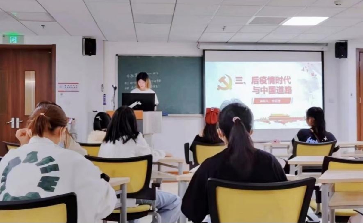最后,来自翻译1901班的李妮珊同学就新冠疫情对世界的冲击以及中国道路对世界的影响展开分享。她基于朱云汉先生书中所著内容进行了分析,并指出新冠疫情揭露了新自由主义的弊端,加剧了民众对西方自由民主体制的怀疑。同时,中国在新冠疫情中的突出表现也进一步展现了大国责任感。在班会的最后,李妮珊同学带领大家回顾了中国在经济融合、政治安全、科技创新、生态环保等方面做出的努力和贡献,鼓励英语2203班新生积极发挥自己的力量,努力学习,报效祖国。