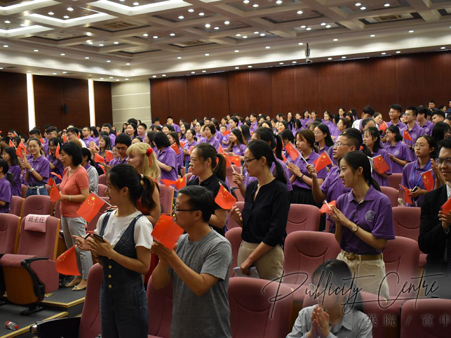 最后,值此祖国七十华诞之际,在专业英语学系系主任李玉霞老师和班主任代表张墨飞老师的带领下,全场师生挥动小国旗,一同唱响“我和我的祖国”,在用歌声表达对祖国热爱的同时,也进一步激发了师生们新时代新担当新作为的奋斗热情。我们祝福祖国母亲永远繁荣昌盛!