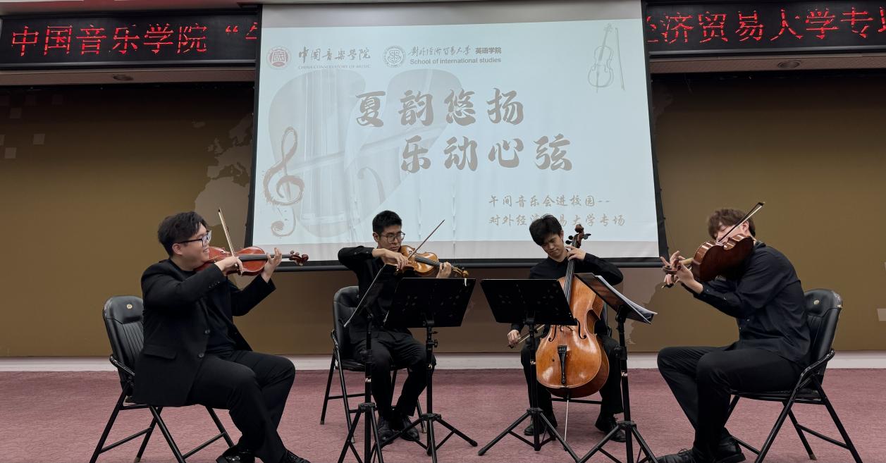 在正式演出环节,来自中国音乐学院管弦系的李智航、杨涵彭、崔玉琪、吴子韬同学为大家演奏了德沃夏克的F大调弦乐四重奏。这是室内乐大师安东·德沃夏克的经典之作之一,被誉为他最受欢迎的弦乐四重奏。德沃夏克在短短的15天内便完成了这部杰作,其优美的旋律、明快的节奏以及四种乐器的愉快互动使其享有持久的知名度。四位同学以饱满的热情、娴熟的技巧、自信的状态演奏了这首名曲。现场时而激情澎湃,时而沉郁幽静,全场师生都沉浸其中。在正式曲目结束后,四位同学在现场的热烈要求下还带来了返场曲目《翻身道情》。