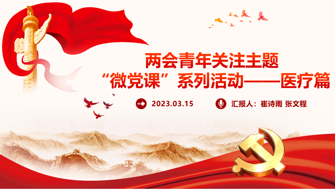 2023年3月15日中午,以“医疗”为主题的微党课在2020级党员张文程和崔诗雨的主持下于诚信1414展开。此次微党课共分为3个部分,分别是:1)关于卫生健康 政府工作报告这样说2)如何提升基层医疗服务的能力?代表委员这样说3)年轻人关注焦点——医疗美容行业安全健康。在第一部分,主讲人带大家回顾了过去5年的发展成就和未来的发展方向,同时介绍了政府工作报告关于医疗卫生建设的改革,未来将继续深入推进健康中国行动,深化医药卫生体制改革,把基本医疗卫生制度作为公共产品向全民提供,进一步缓解群众看病难、看病贵问题。第二部分主要介绍了4位**表对于推动优质医疗资源扩容下沉和区域均衡布局的见解,并且为同学们播放了视频,真实再现了全国政协委员陈伟鸿在两会驻地和另外两位委员进行连线的画面。最后一部分内容主要包括医疗美容行业安全健康,介绍了冯春林提出的三点建议,包括强化行业监管,规范医美机构内部管理;强化政策研究,规范医美机构用人导向;建立帮扶机制,促进临床药师多点执业。此次医疗篇微党课获得圆满成功。