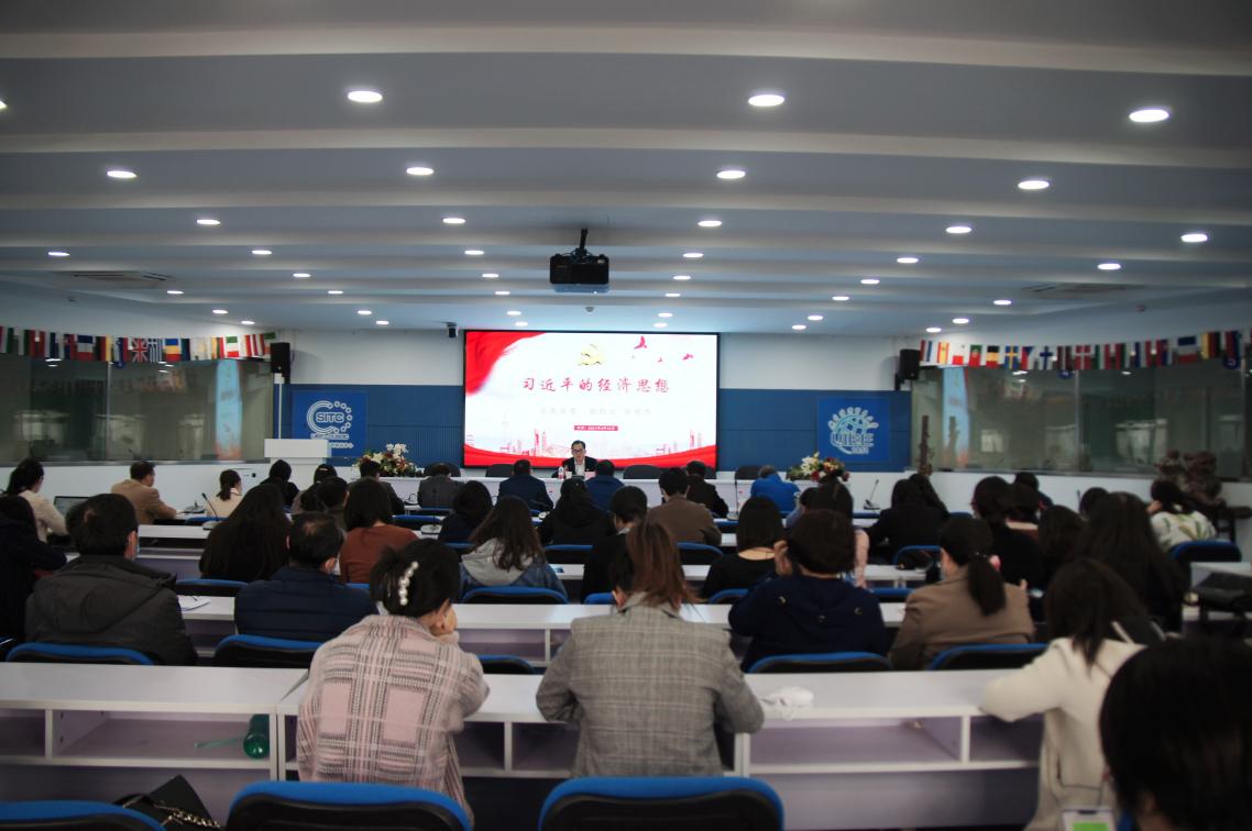 4月15日下午,校党委常委、副校长洪俊杰教授在诚信楼1412报告厅讲专题党课,深入解读习近平的经济思想,指导结合学校事业发展和各部门工作实际,深入学习领会习近平新时代中国特色社会主义思想,推动党的创新理论学习走深走实。党课由国产自拍 党委副书记项洁主持。国产自拍 、外语学院、国际合作交流处、国际学院、校友总会/教育基金会、学术刊物部、档案馆、商务汉语基地等八部门的领导和教职工党员一百三十余名参加学习。