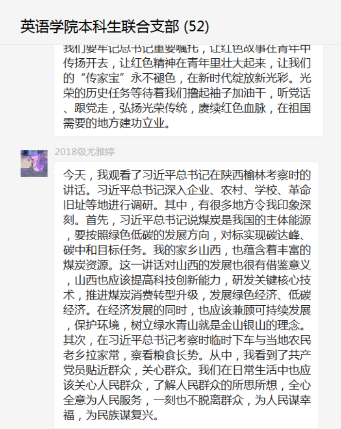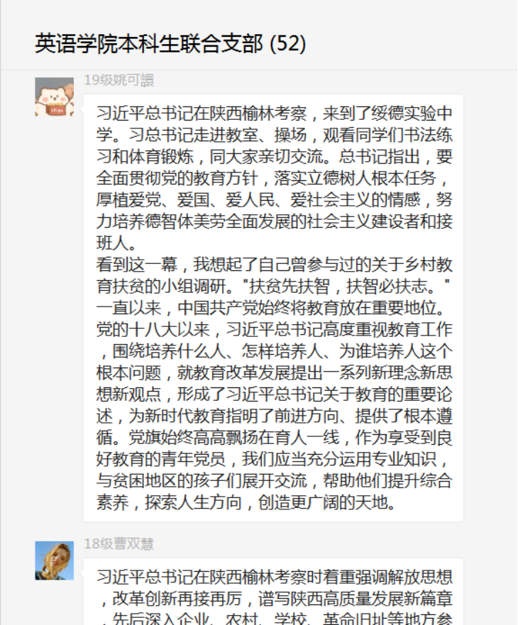 2018级党员周洋谈到,在榆林考察期间,总书记经过田间地头,下地与劳作的农民交谈,亲切友好;随后还参观了学校,为孩子们献上“我祝你们成才”的祝福。我深深地被总书记的爱民情怀感动,看到国家这样关心每一个公民,作为预备党员的我也感到任重道远。党员的本质,就是全心全意为人民服务,孔子说“在其位谋其政”,就是说我们每一个党员都应该一马当先,为服务人民而不懈奋斗,真正将“爱党、爱国、爱人民、爱社会主义”的情感落到实处,在生活当中努力培养自己成为德智体美劳全面发展的社会主义建设者和接班人。”