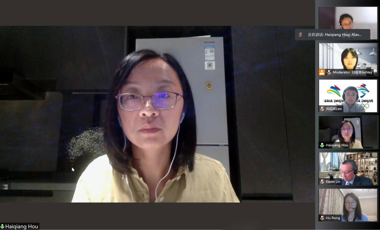 侯海强女士首先发表了题为“北京冬奥遗产与可持续发展”的主旨演讲,和大家分享了本次冬奥会中的环保理念与减排措施,讲述了北京冬奥组委为达成碳中和而做出的各类创新实践。