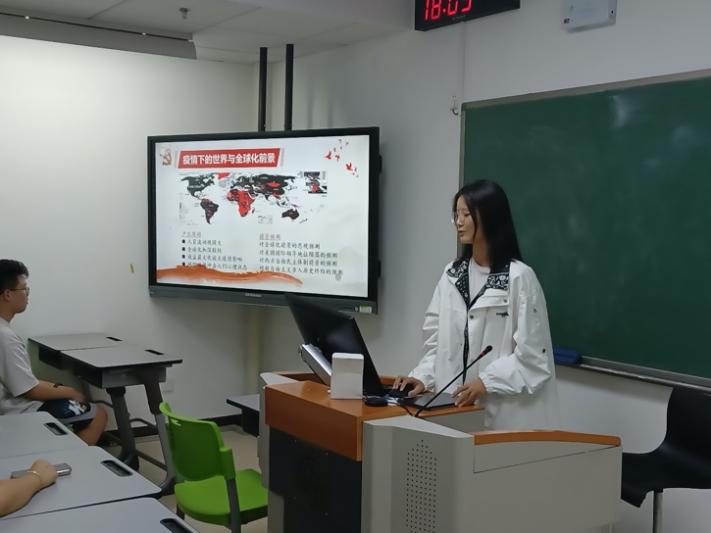 最后,英实2001班的舒祎璋同学将与大家分享新冠肺炎疫情对全球经济的冲击和中国发展之路对全球经济的影响。在此基础上,她对朱云汉的著作进行了分析,认为新冠病毒爆发暴露了新自由主义的缺陷。舒祎璋还介绍了中国在经济一体化、政治安全等领域所做的努力与贡献,并勉励英语2304班的学生要以自己的能力为己任,为国家服务。