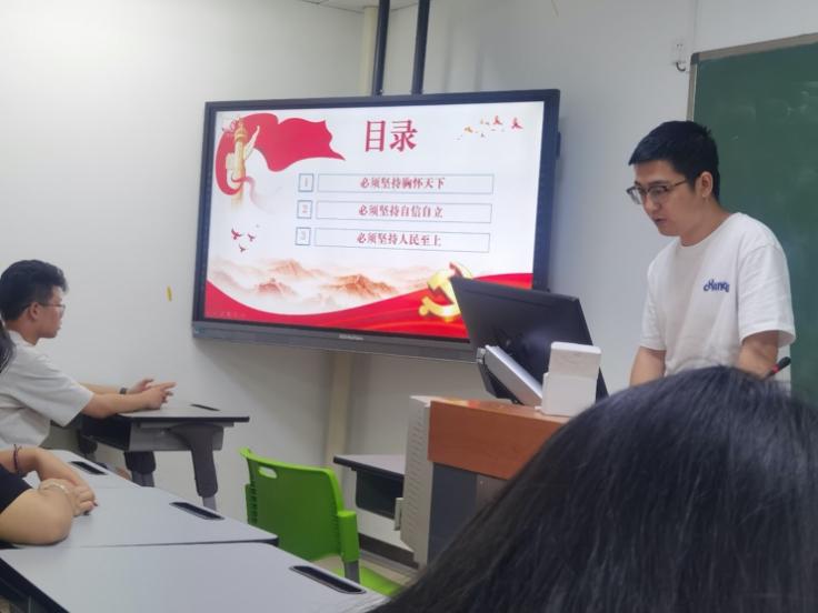 最后,张文程同学针对“必须坚持人民至上”分享了自己的见解。她用一位位耳熟能详的老劳模,向这些劳动模范的精神致敬,启发大家身为青年学生要不怕苦不怕累,奋斗是青春最亮丽的底色。张文程同学还通过《觉醒年代》中的一小段镜头,让新生们体会到那一段波澜壮阔的岁月对中国人的觉醒起到的重要作用。