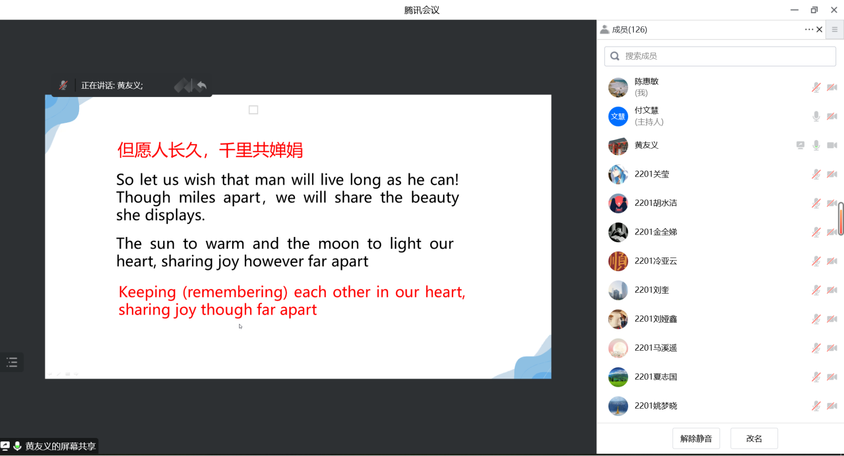 通过今天的讲座,我对《习近平谈治国理政》这本书以及国际传播过程中译者应当注意的问题有了更加全面深刻的了解。黄教授提到,译者在国际传播中应当注意避免造成读者误解,这一点令我印象非常深刻。通过此次讲座,我学到了很多实用的翻译技巧,对我解决翻译过程中很多问题都有帮助,比如汉语四字词语以及标题的英译技巧等。十分感谢老师组织和分享此次讲座,希望以后可以多多举办类似讲座!