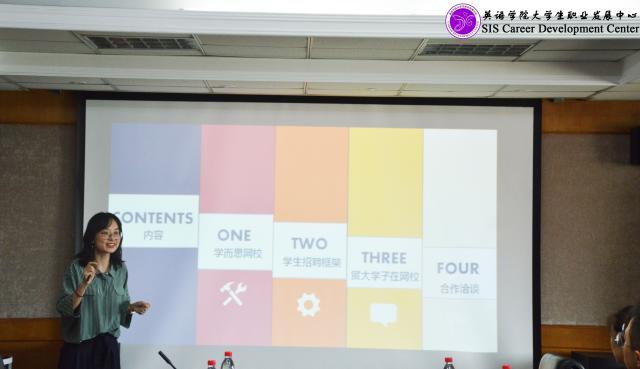 学而思喻丹老师介绍了学而思网校发展情况和招聘市场情况及趋势,并详细讲解了规划的合作项目,其中包括企业参访、英语比赛、支教培训、职业讲座等。