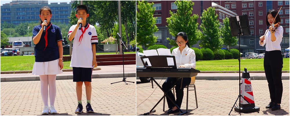 的同学和老师们选择了《歌唱祖国》和《天耀中华》两首经典歌曲,由学生演奏电子琴、小提琴进行伴奏,四位领唱学生、两位领唱老师以及数十名师生共同和声唱响,激昂的歌声和丰富的表演形式吸引了路过的老师、同学纷纷驻足,大家挥舞着国旗齐声高唱,还有的同学拿出手机拍照和摄像,记录下这个精彩的时刻。