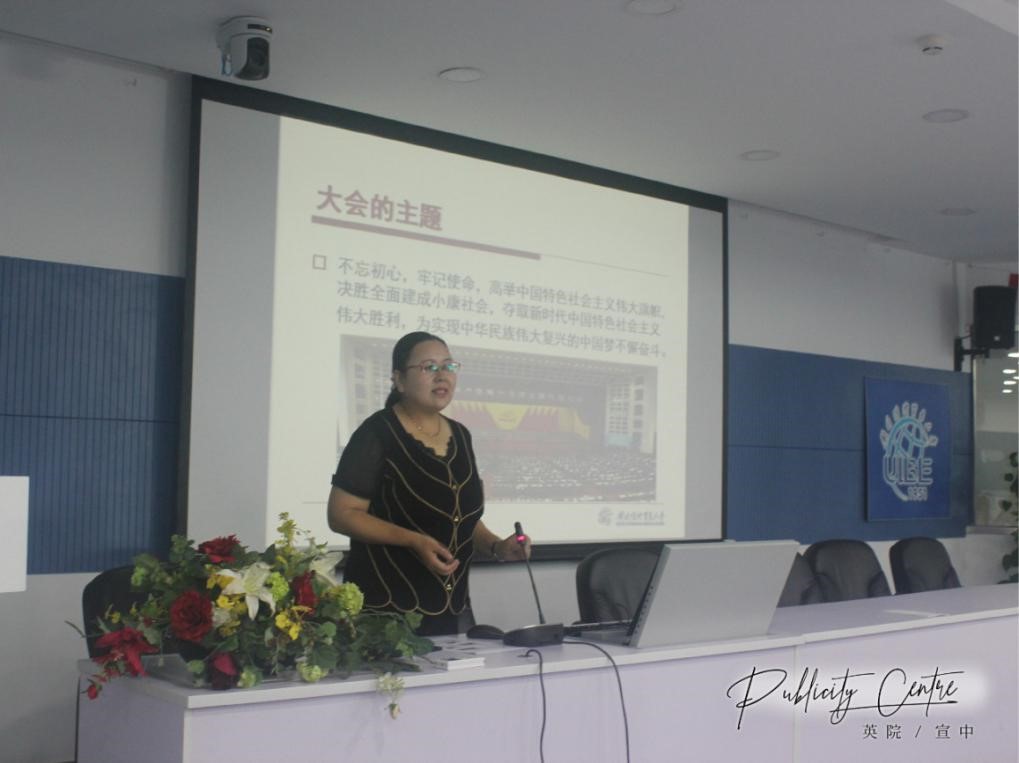 紧接着刘书记以几个“新”字开头的关键词,详细解析了十九大报告精神。报告要求每一位中国公民都应作好走入新时代的思想准备,尤其是新青年们,要武装自己的头脑,为中国特色社会主义走向新时代贡献自己的力量。在提到领会新思想时,刘金兰书记结合中国近代史详细阐述了传承与发展是相辅相成的观点 --- 对外取其精华、对内发扬优良传统,广开国门,而不是固步自封,这样才能发展且赢得尊重。刘书记还提出,我们应明确全面建成小康社会的新目标,肩负起新使命,以朝气蓬勃之姿踏上新征程。她向同学们提出:“英语专业学生在文化传播与传承、文化强国建设方面应承担什么责任?”这一问题引起了在场的19级新生的深思。
