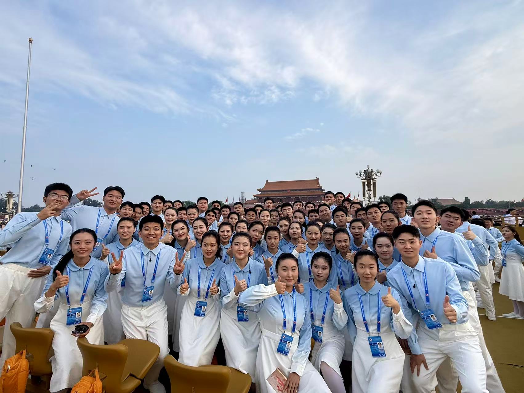 9月3日上午,纪念中国人民抗日战争暨世界反法西斯战争胜利80周年大会在北京隆重举行。在这场铭记历史、致敬英烈的盛典中,86名贸大青年作为广场合唱团成员,共同演绎了《松花江上》《在太行山上》《保卫黄河》等7首歌曲,其中5人来自国产自拍 ,分别为我院分团委书记王超老师、2023级本科生刘潇然、2024级本科生刘林峻、2024级本科生张宇昊、2024级本科生陈卓。他们用嘹亮的歌声唱响青春风采,接受祖国的庄严检阅。我院辅导员张杉杉老师在天安门观礼,现场感受人民军队的威武之师、大国重器的震撼力量!