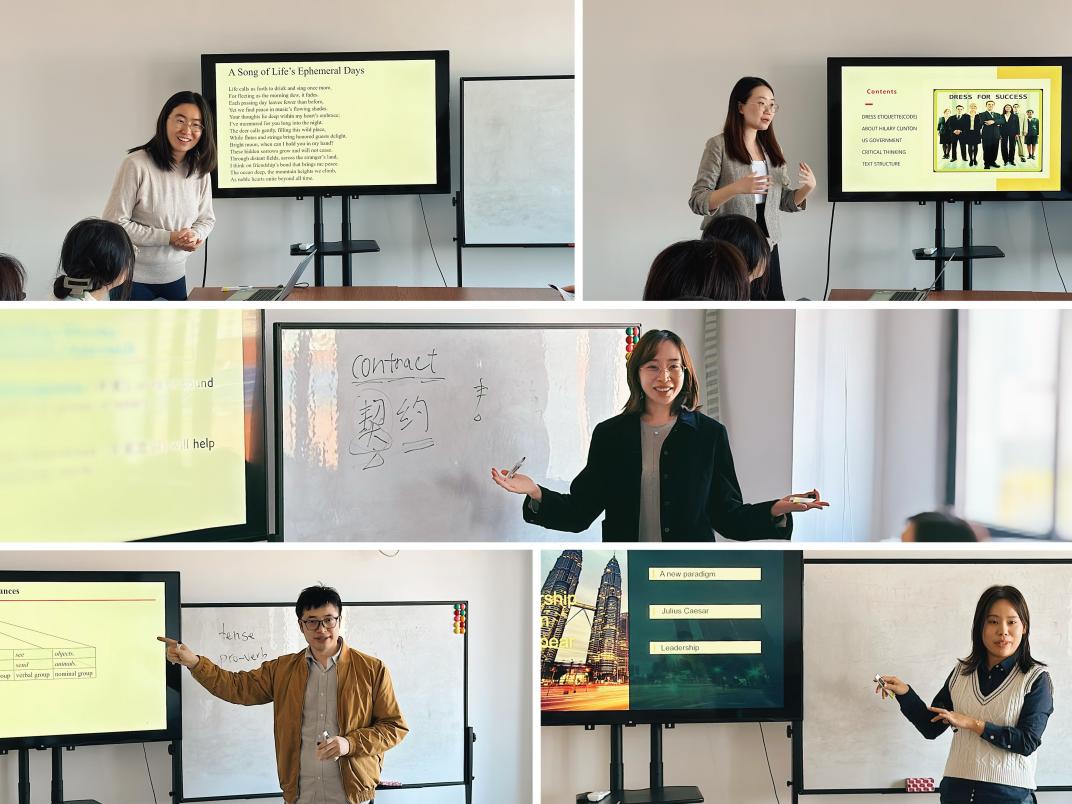 比赛成绩采用百分制,由教学设计(占比20%)、教学演示(占比70%)和学生评价(占比10%)三部分组成。五位参赛选手分别就莎士比亚十四行诗、成功人士的着装、商务英语阅读技巧与策略、物质过程和心理过程小句的辨别、管理学训练等主题提交教学设计方案并进行15分钟的教学演示。经过激烈角逐,其中四位老师将代表学院参加校级比赛。