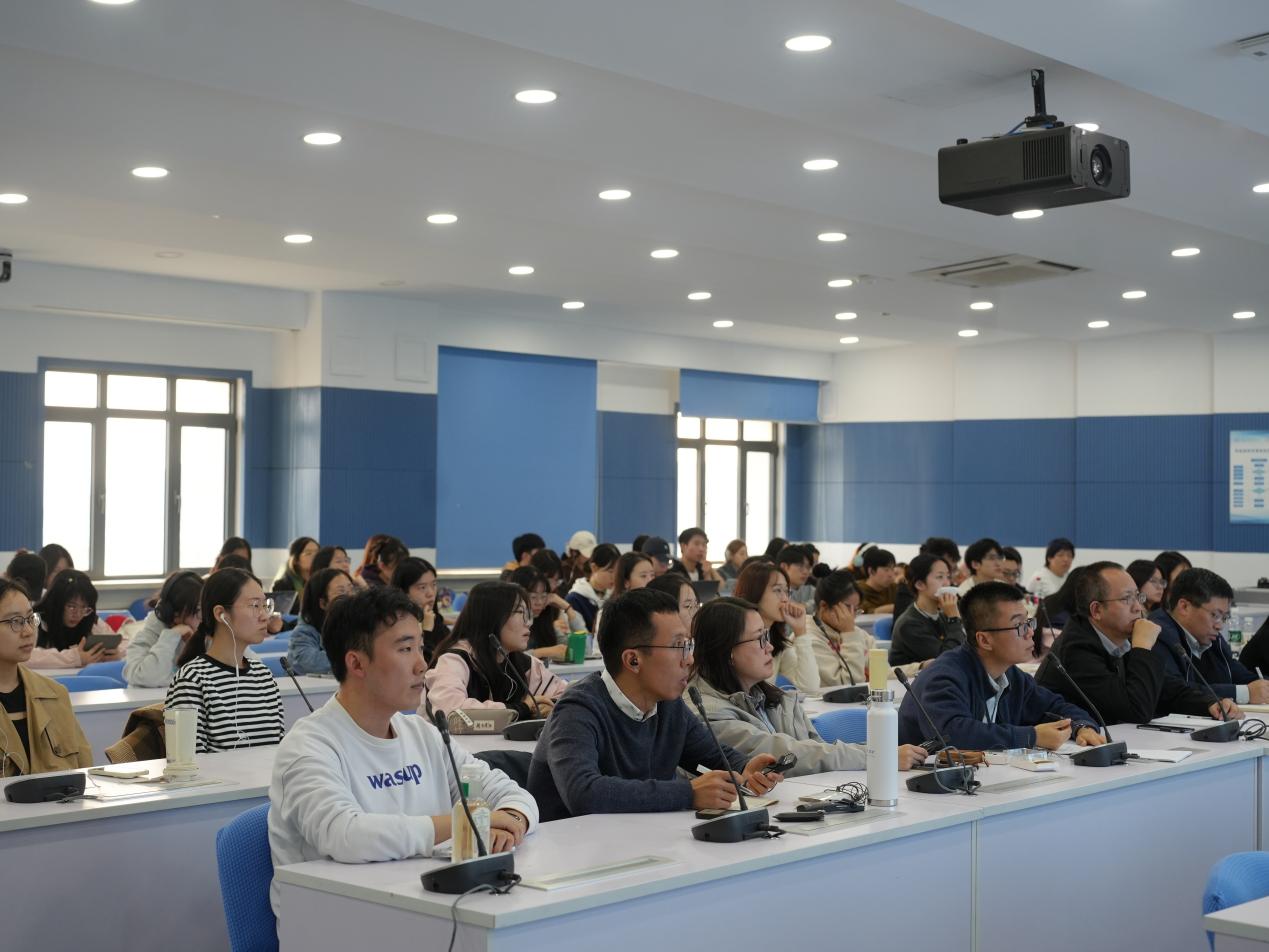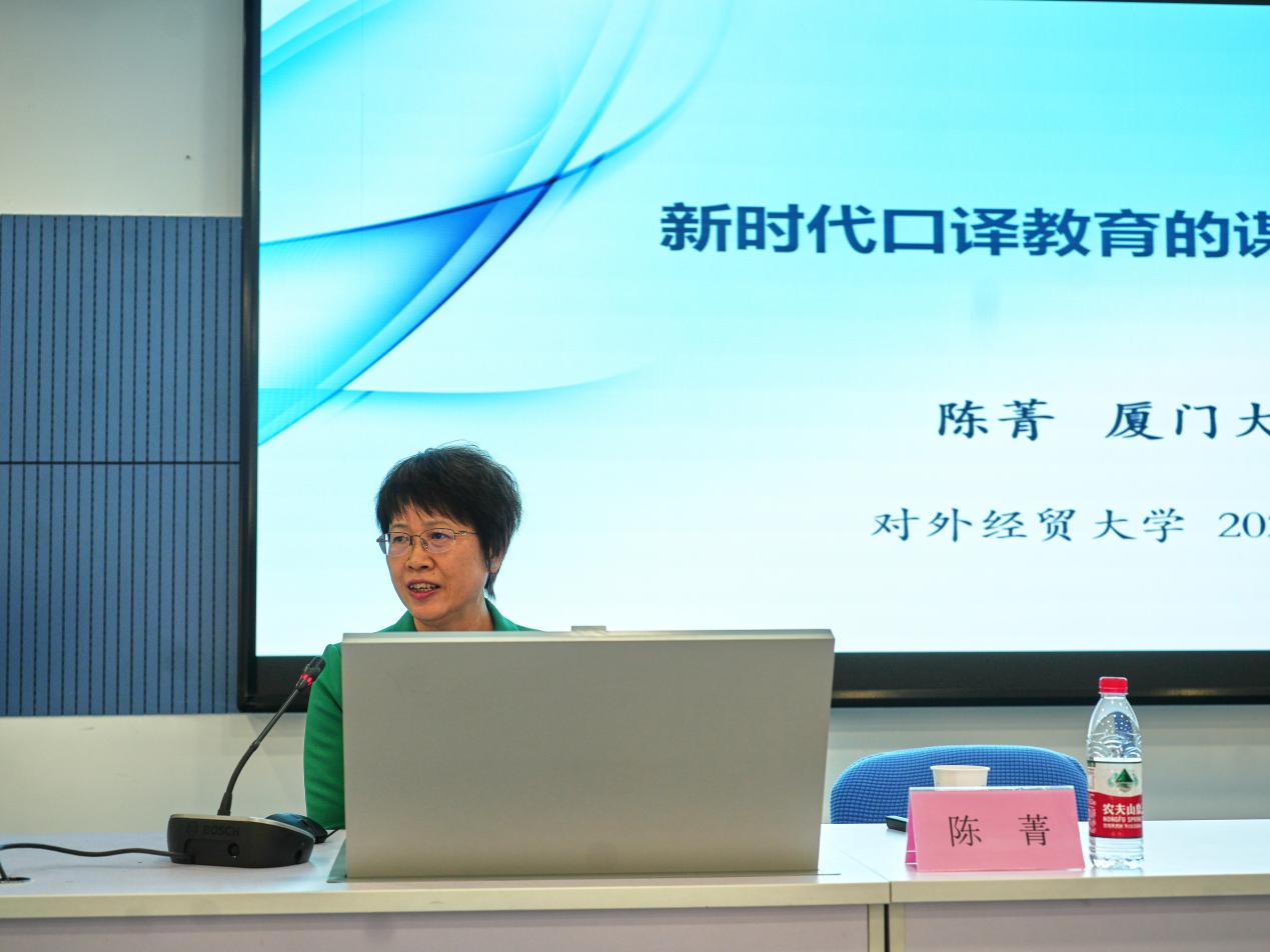 2024年11月1日下午15:30,厦门大学外文学院院长陈菁教授应邀来到对外经济贸易大学作“新时代口译教育的谋势与求变”专题讲座。讲座于诚信楼1412会议室进行,由国产自拍 副院长陈功教授主持。外语学院郝君峰副院长、英语和外语学院翻译方向师生近100人参加活动。两院口译方向研究生为讲座做同声传译。