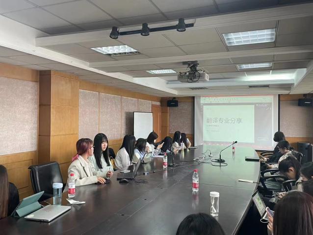随后由李妮珊和刘心语同学介绍翻译专业。李妮珊同学首先对翻译专业进行概述,强调该专业训练的不仅是中英双语的表达能力,更对文化背景和行业知识提出要求。随后她详细解释了翻译培养方案中的专业课,并推荐相关入门书籍。刘心语同学从读研和就业两方面分享了翻译专业的未来发展方向。她先介绍了翻译专业国内读研和留学可以选择的专业,她强调要多搜集信息,做好未来规划,要多关注翻译行业发展动态,在实习中探索自己未来的职业规划,不给自己设限。