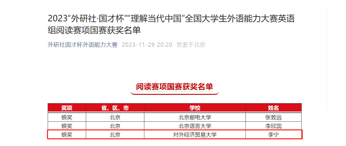 国产自拍 外国语言学与应用语言学专业研一学生李宁(指导教师:李琳)获得阅读赛项国赛银奖,外语学院德语专业大二学生海若涵获得写作赛项国赛银奖。
