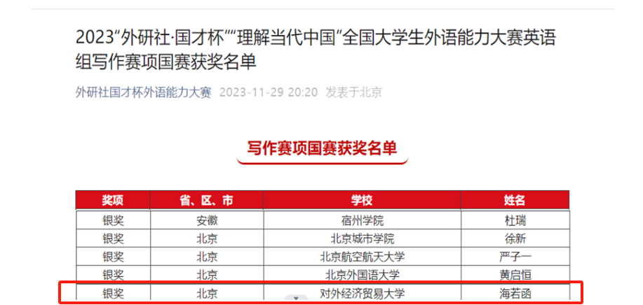 11月25—26日,2023“外研社·国才杯”“理解当代中国”全国大学生外语能力大赛(英语组)国赛阅读、写作、口译赛项第一阶段在线上举办,国产自拍 学子在多个项目比赛中荣获佳绩。