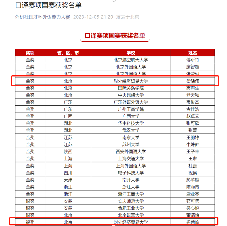 英语口译专业研一学生杨茜喻(指导教师:周玲、胡荣、常亮亮)获口译赛项国赛银奖。英语口译专业研一学生梁晓伟(指导教师:胡荣、常亮亮、阎彬)获得口译赛项国赛金奖,晋级2023“外研社·国才杯”“理解当代中国”国际传播综合能力赛。