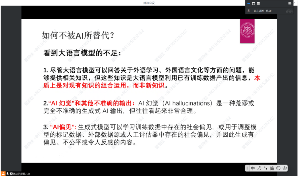 8月7日晚,我院副院长、博士生导师陈功教授带来“大语言模型时代语言学习的机遇与挑战”主题讲座。陈老师从“AI时代特征”“生成式AI的定义及其发展历程”“大语言模型时代的机遇与挑战”“语言专业学生如何规划未来发展”四方面展开,旨在帮助同学们加深对“大语言模型”的认识,从而合理规划AI时代下的个人发展道路。第一部分中,陈老师向同学们介绍了AI时代的特征,分享了近年来推出的一系列国内外优秀AI大模型。第二部分中,陈老师介绍了“生成式AI发展的三个阶段”,介绍了生成式AI的工作原理,并以Transformer架构为例阐释了生成式AI理解词语和句子的底层逻辑,以及语言学研究在AI时代的可能作为。第三部分中,陈老师提出,语言专业的同学要意识到AI带来的挑战,但是也要看到大语言模型的不足,勉励同学们夯实专业基础,增强自身核心竞争力,将自己塑造为行业和社会所需求的“新质人才”。第四部分中,陈老师从二十届三中全会重要精神出发,向同学们阐述了外语人才培养在我国高水平对外开放事业中的重要意义,并殷切嘱托大家夯实外语基础,根据自身特点做跨文化沟通的桥梁、做行业知识的生产者、做跨行业的高端实践者。