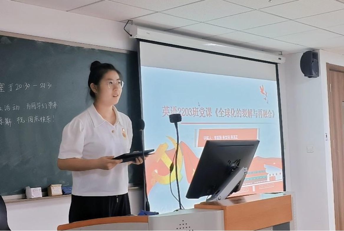 三位党员分享结束后,英语2203班班长欧念静同学分享了对本次“全球化”主题班会的理解。她认为,在疫情、战争等世界背景下,全球化的发展让新时代青年充分认识到中国在全球化过程中的积极表现与作为。