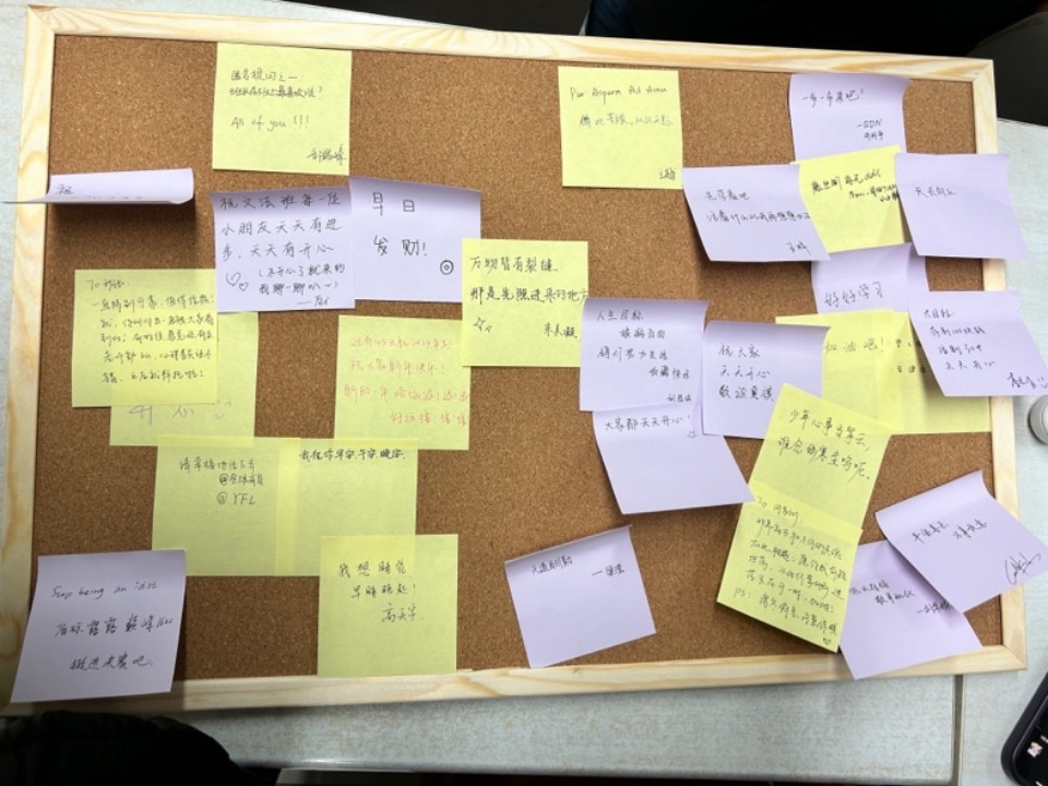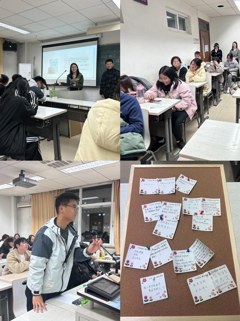 文法2301班班会以“加强心理教育,发挥团队力量”为主题,由“心理健康知识宣传”“信箱提问”“团体创作拼贴画”三个环节组成。同学们积极分享、认真倾听。在团体创作环节,同学们将自己的心里话、座右铭等写在了便签上,最终构成了有“文法”字样的、独特的拼贴画。