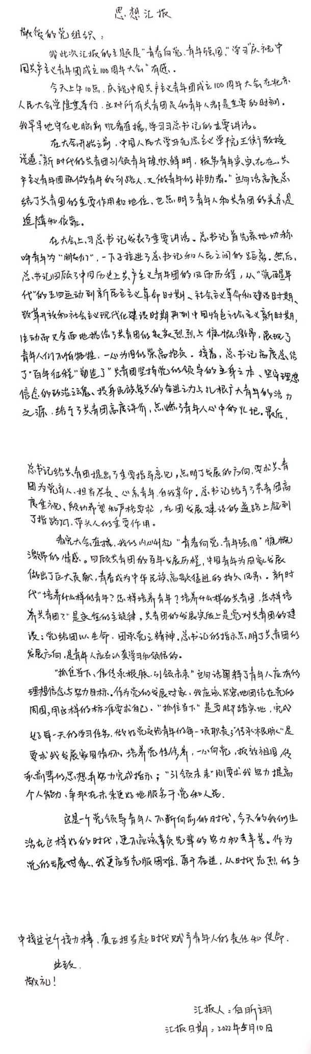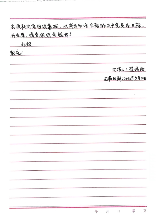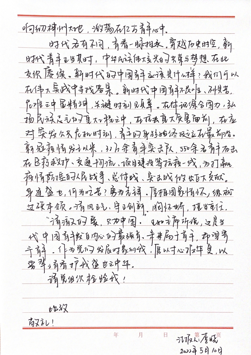 2020级张文程谈到,在实现中华民族伟大复兴的征程上,中国共产党是先锋队,共青团是突击队,少先队是预备队。入队、入团、入党是青年追求政治进步的“人生三部曲”,作为党的发展对象,我会时刻铭记习近平总书记在建团一百周年大会上的讲话,铭记党的嘱托和团的培养,为时代中国贡献属于自己的强国之音,不断开拓更加美好的未来。