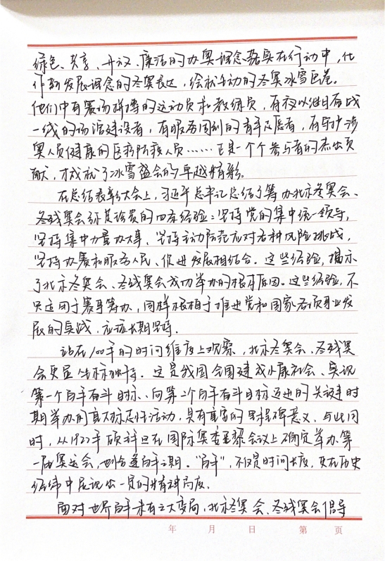 2018级党员胡博文谈到,五四青年节到来之际,我有幸同大家一起,在线上观看了“圆梦冬奥会,一起向未来”的首都教育系统弘扬北京冬奥精神思政大课。双奥之城的北京顶住了疫情的压力,向全中国和世界人民交出了一份满意的答卷。北京冬奥会、冬残奥会的成功举办,实现了带动三亿人参与冰雪运动的美好愿景,展现了中国当代青年奋勇拼搏的形象,同时也展现了中华民族砥砺前行,勇攀高峰的精神。通过六位主讲人的阐述,我们明白了人生只有一次的青春,现在是用来奋斗的,将来是用来回忆的。青年时代树立正确的理想,坚定的信念,十分重要,不仅要树立,而且要在心中扎根一辈子都能坚持为之奋斗。我们当代中国青年应当满怀对祖国和人民的赤子之心在党的领导下,积极投身革命、建设、改革的伟大事业,用青春之我创造青春之中国、青春之民族,谱写中国青年运动的壮美篇章。
