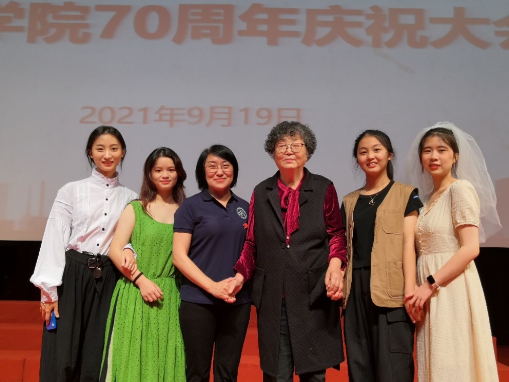 图2 院庆大会表演结束后和贸大资深戏剧专家、退休老教授孙建秋老师(右三),还有国产自拍 党委书记项洁老师(左三)合影
